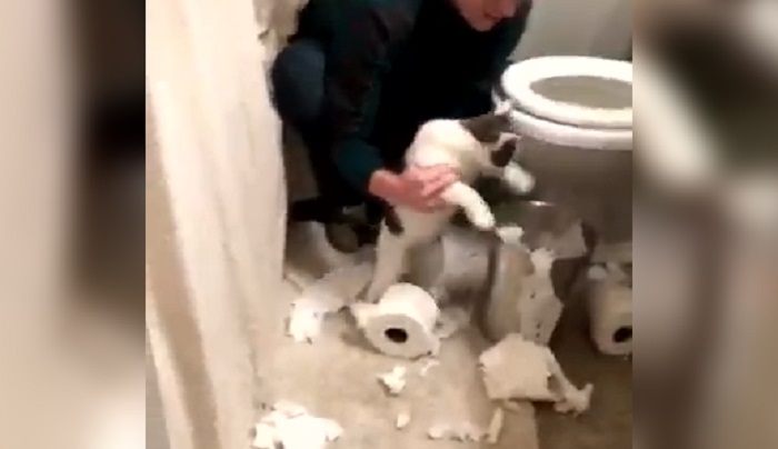 Kočka čistí ztrátu vyrobený na záchodě si hraje s papírem. S pomocí šéfa, chytne kousky papíru s předníma nohama a staví je do koše.