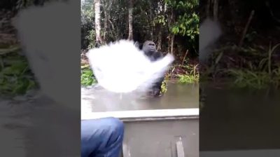 Gorila, který byl narušen skupinou turistů, To se blíží nabídnout jim dárek.
