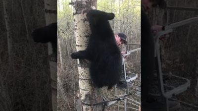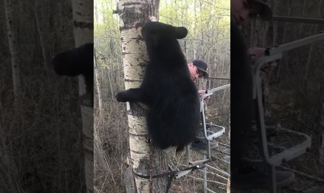 Zvědavý medvěd leze na strom, aby bylo vidět zblízka lovce. lovec, sedět v klidu a stále, dokud medvěd uspokojit zvědavost.