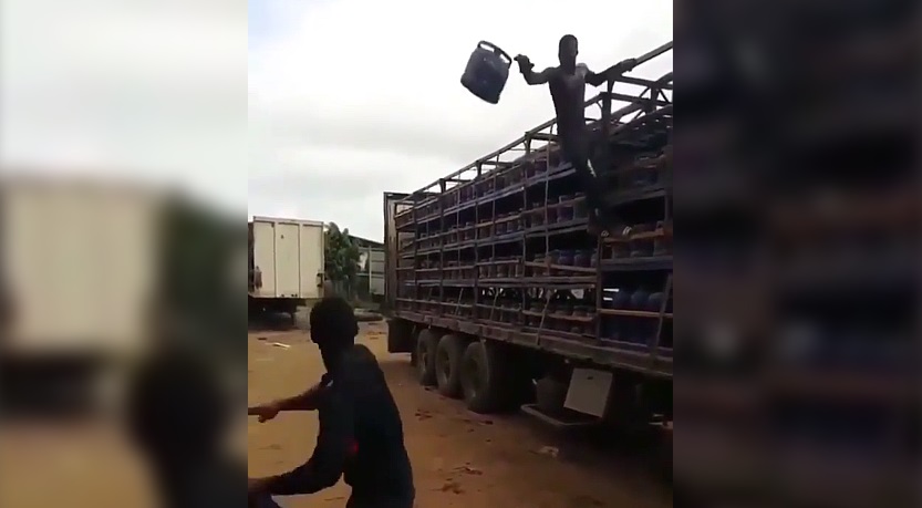 Dva muži načtení lahví rychlost plynu na vozíku.