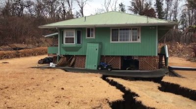 Obrovské sopečné trhlina v jejím domovském okrsku Leilani Estates Havaji, zaznamenán dne 21. května 2018.
