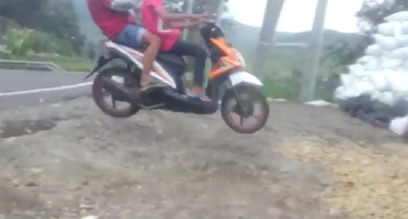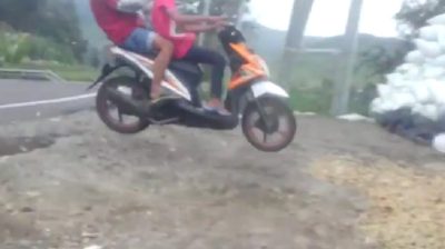 Město Mojokerto, ostrovy Jáva (Indonésie), motocyklu se dvěma jezdci pohybující se vysokou rychlostí a řidič ztratí kontrolu v zatáčce. Mladíci se srazí na ochrannou bariéru a uniknout nejhorší.