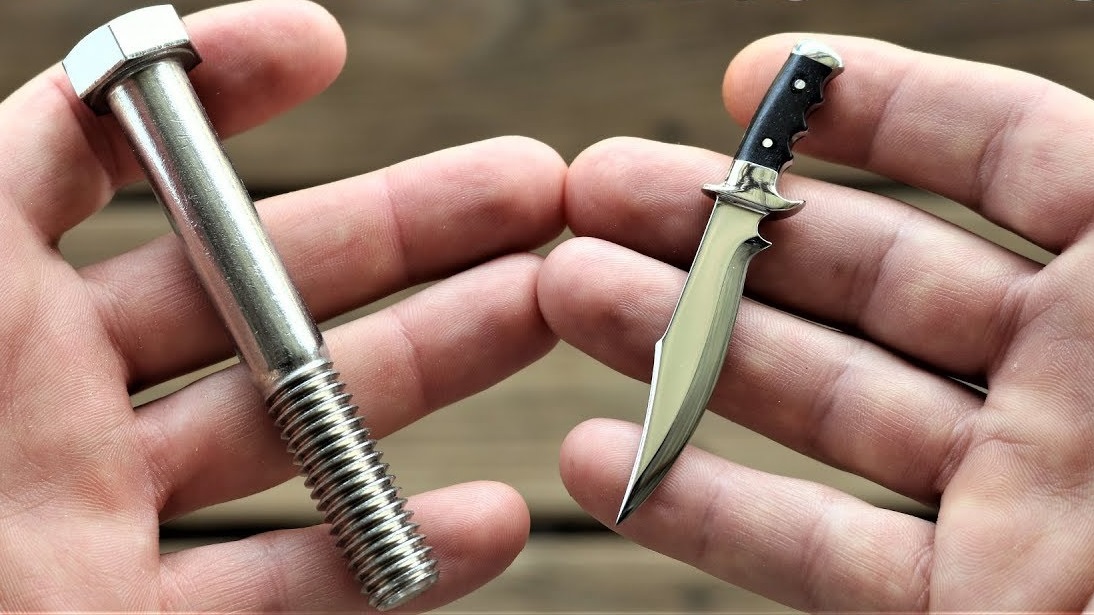Řemeslník Bobby Duke staví lovecký nůž miniatura, přičemž jako základ ocelový šroub.