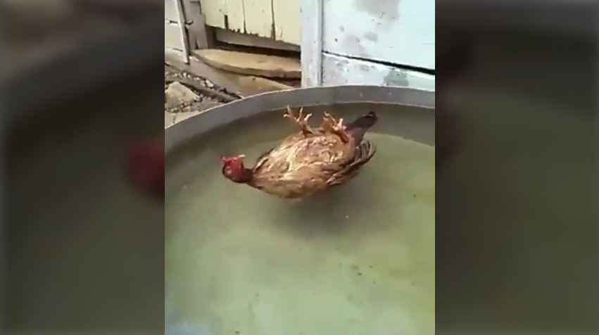 Zemědělec zjistí, že jeden z kuřat spát ležící v hrnci s vodou. Vířivka pro nosnice;