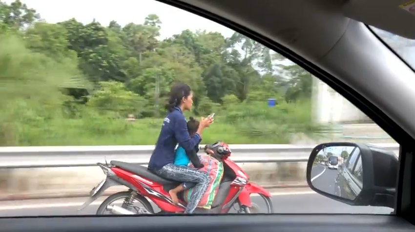 Na ostrově Phuket v Thajsku, matka píše zprávy na její mobilní telefon při jízdě stroje a přenášely malou dceru. V některých případech zcela opustí volant vstoupit na mobil.