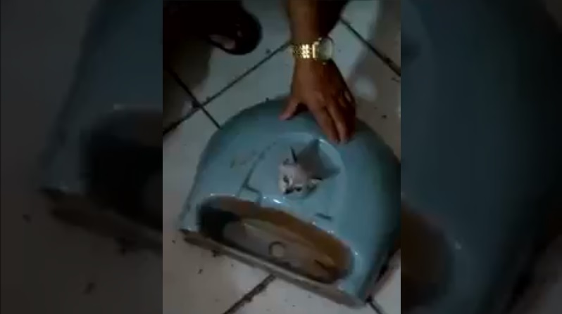 Pracoviště v Portugalsku, nalezna člověk kotě s hlavou uvízl v porcelánové umyvadlo. pečlivě rozbil umyvadlo s kladivem, uvolnění malé zlobivé kotě.