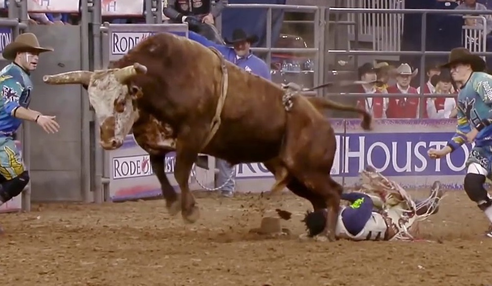 2017, American Cowboy Neil Holmes jako zázrakem unikl před rozdrcený býka v výstava hospodářských zvířat přehlídka a Rodeo, jeden z největších rodeo show ve světě se každoročně koná v Houstonu. Zatímco muž je vleže, majestátní zvíře klesá se všemi jeho hmotnosti na zadní nohy pro zamezení cm hlava kovboj.