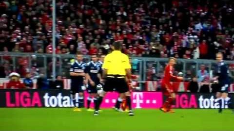 Ve fotbalovém utkání mezi Bayern a Kolín nad Rýnem, míč vyskočí po bití faul od Daniel van Buyten.