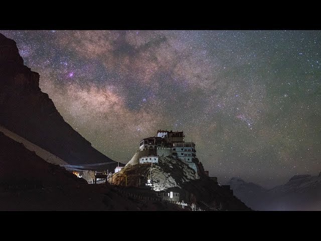 Tibetské nebe v noci byl zajat v těchto krásných obrázků s vyznačením umístění úžasné budovy a sochy v Himalájích.