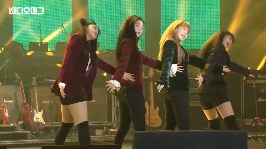 K-Pop dívčí skupina Red Velvet z Jižní Koreje předvádí živě píseň „Red Flavour“ před Kim Čong-unem a publikem Severokorejců.