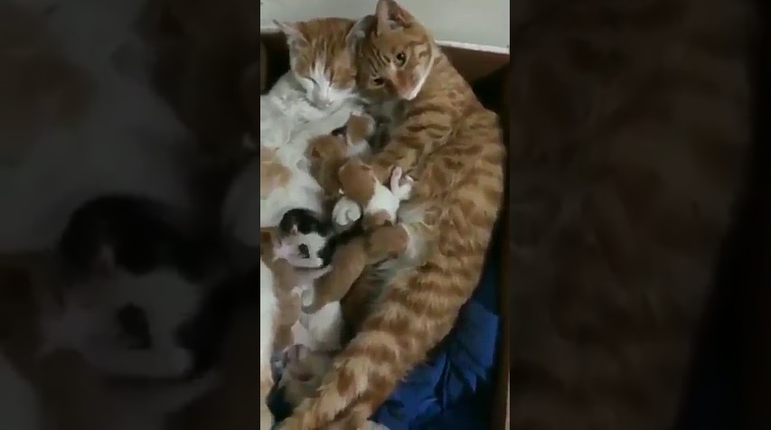 Kočka a kočka ležet volně v krabici, spolu s jejich narozených koťat.