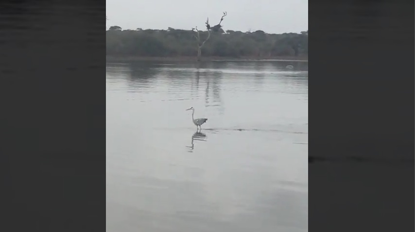 V Národním parku Kruger v Jižní Africe, turista zaznamenal povedenou scénu s jeho mobilní telefon. Heron stojící na zádech hrocha, Zdá se, jako by kouzelně klouže po vodě.