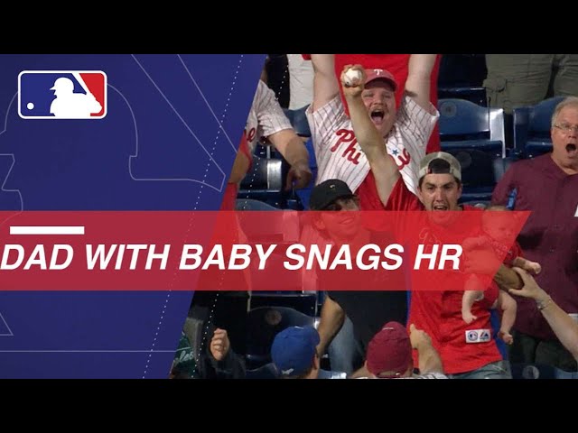 Maikel Franco zahajuje svůj druhý homerun hry, a ventilátor je obrovský úlovek zatímco drží dítě ve svém druhém rameni