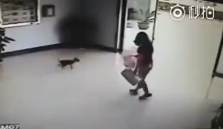 V Číně, Tři psi postupně udělat stejnou chybu a srazí na skleněné dveře, zatímco běží směrem k východu z budovy.