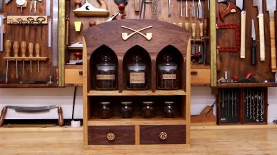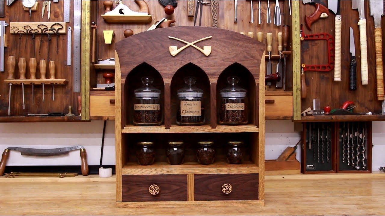 Carpenter Moris Chorvatsko vytváří malou skříň pro uložení druhů tabáku dřeva dubu a ořechu.