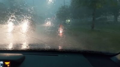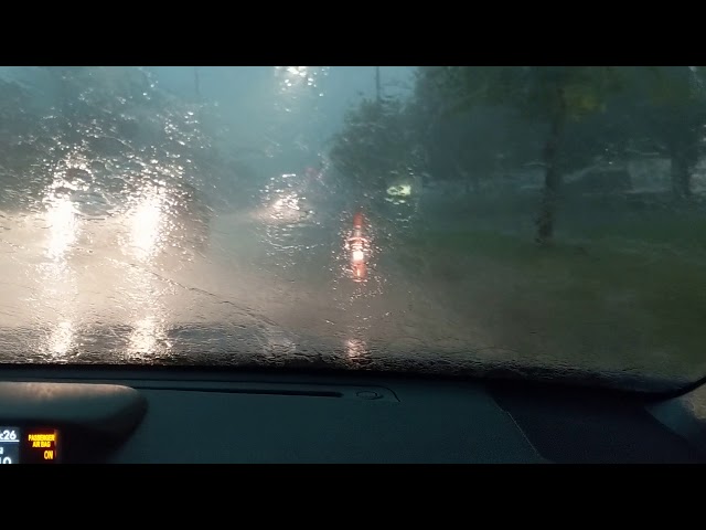 Motoristé opatrně sledovat dopravní kužel na zaplavené silnici.