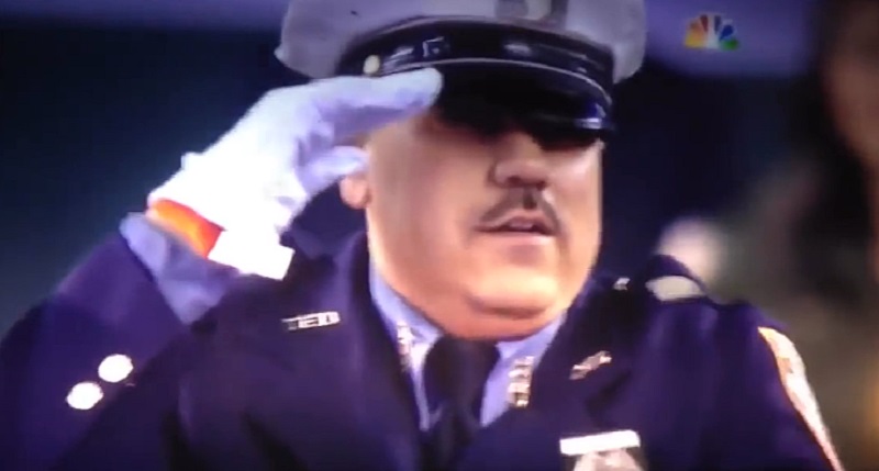 Před startem amerického fotbalu, Mnoho lidí se shromáždili ve středu pole potřást vlajku. Avšak úhel a zoom výstřely je velmi nešťastné.