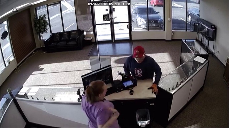 Neděle 02.09.2018 v Denveru, muž pokusil vyloupit elektronického obchodu cigareta. Zatímco se blíží k lavičce, Ten muž vzal pistoli (vzduchovka airsoft) obrátit se na prodejce.