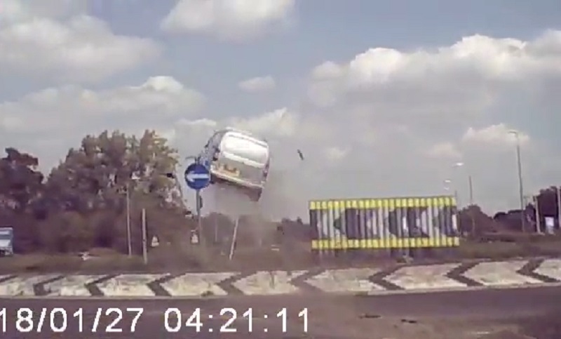 V Británii, dodávka pohybuje nadměrné rychlosti dosáhne ke kruhovému objezdu a stříká do vzduchu, že narazí na obrubník.