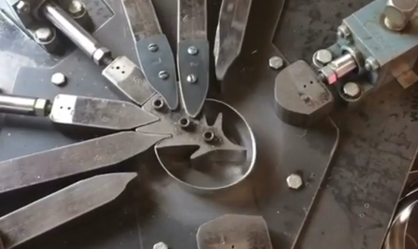 Stroj na tvarování kovových pásků v pečicích forem různých tvarů.