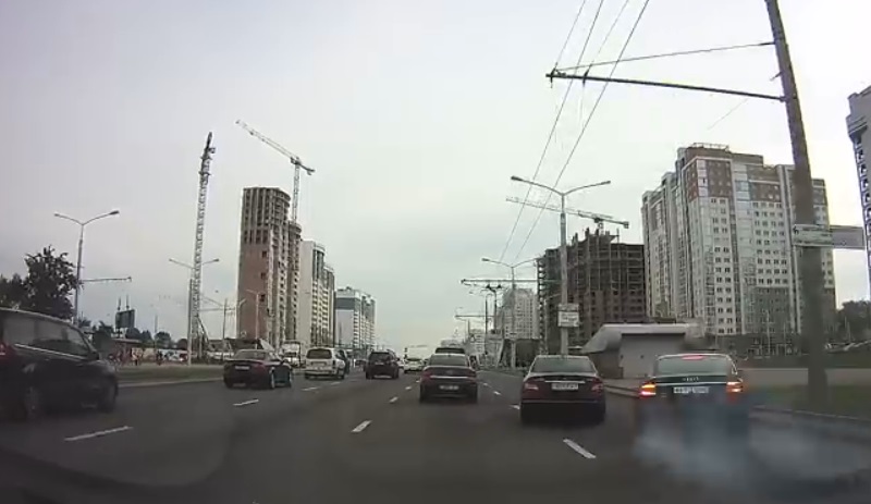 Nehoda v městském Dzeržinského Rusku, kde řidič zadá bez pohledu do zrcadla v pravém jízdním pruhu, zatímco druhá se zrychluje.