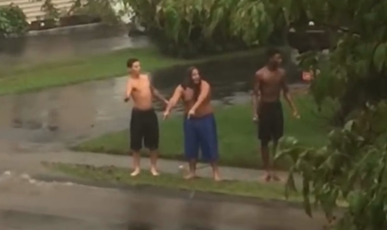 25. září ve Spojených státech Hamden, Tři mladí muži stojící na okraji zatopené silnice a požádat řidiče smáčení jejich.