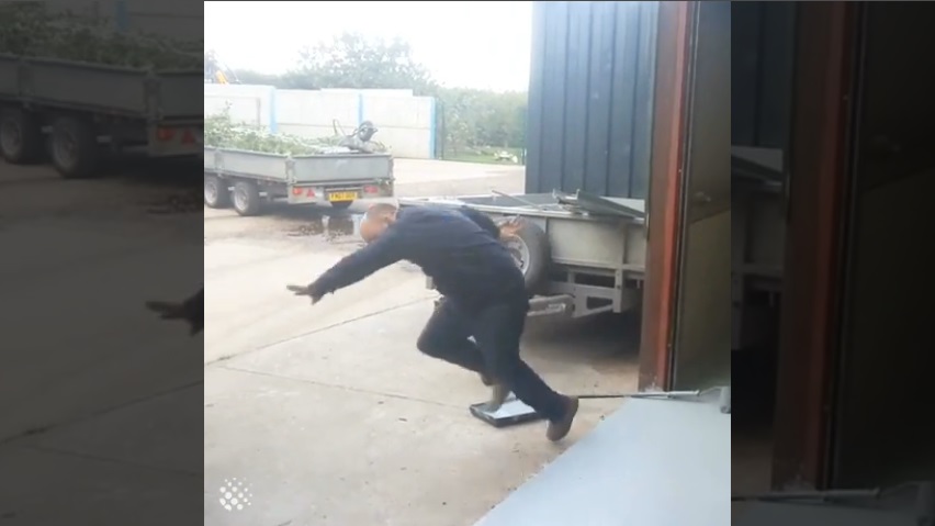 Člověk se snaží dostat ven z budovy, vyhýbat se stoupnout na čerstvý nátěr na zemi.