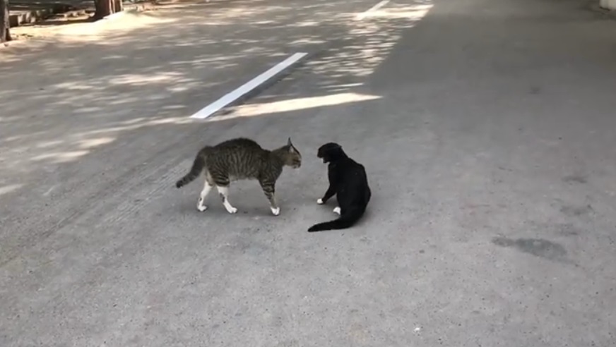 Dvě kočky hádat na chvíli na silnici. Nakonec, velká kočka zasáhne oddělit.