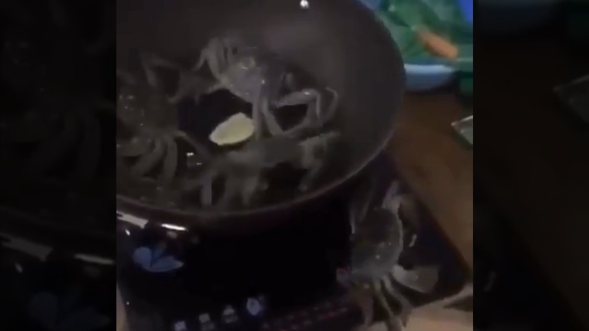Krab uniká z pánve, která je pečené, a jít ven a zavře troubu, aby zachránil své přátele.