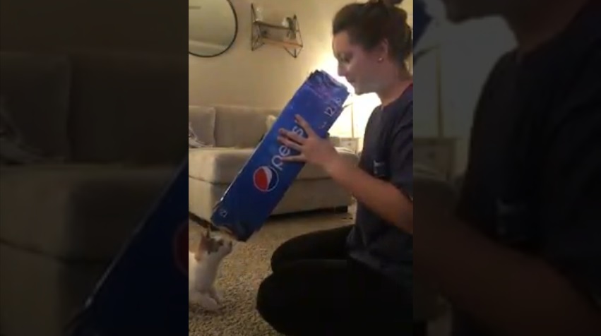 Kočka napadá majitele,, Při pohledu přes kartonové krabici.