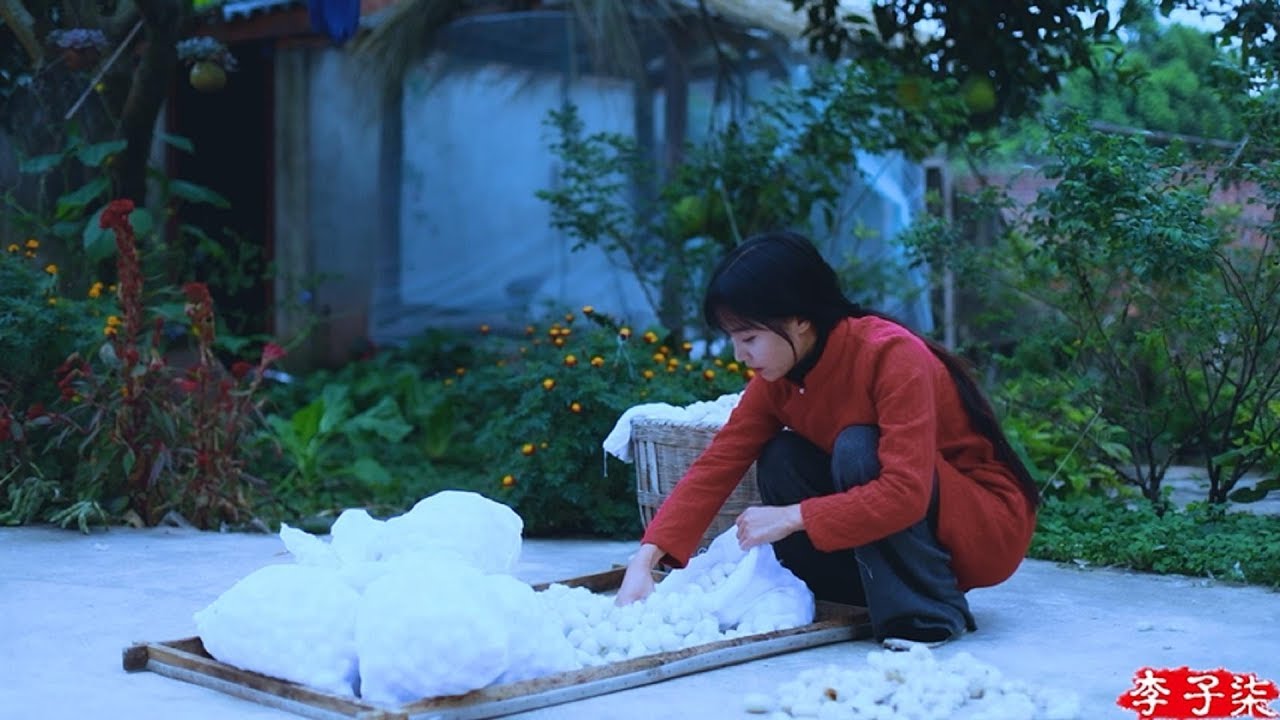 Čínská Li Ziqi ukazuje tradiční způsob sklizně a přípravy tkaniny hedvábí.