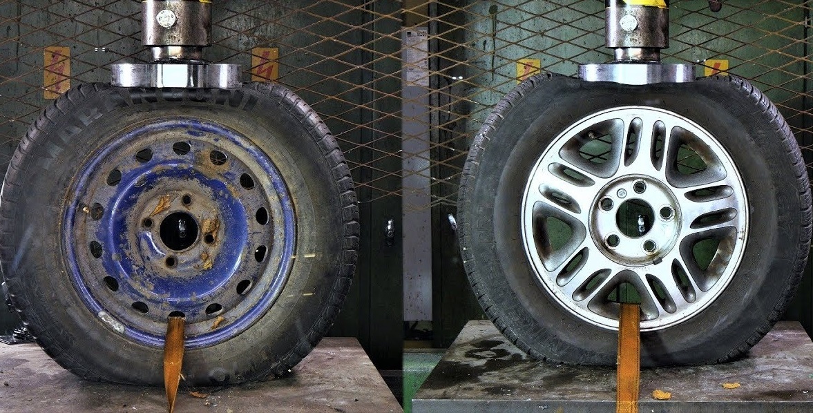 Srovnání odporu mezi standardním ráfku oceli, proti okraj hliníkové slitiny. Kola byly testovány v hydraulickém lisu.