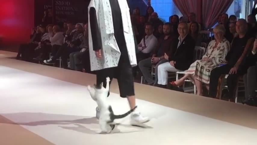 Během módní show v obchoďáku Emaar Istanbul, kočka vylezla na lávku a byl horlivý hrát.