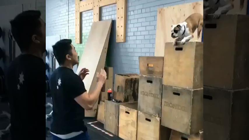 Pes stojící na některých dřevěných beden, se snaží skočit do náručí svého šéfa. Poznámka styl po úspěšném skoku.