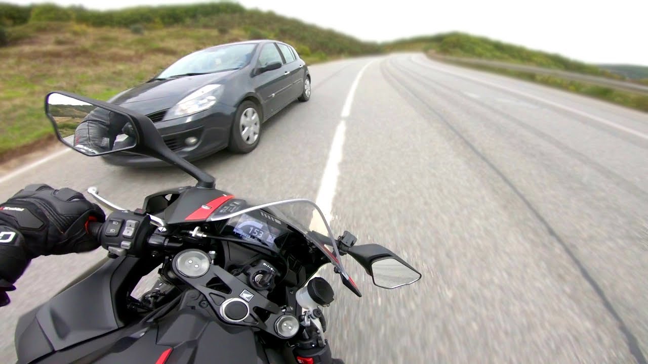 Motocyklista s Honda CBR 1000RR pohybuje při vysokých rychlostech spolu s řidičem v Lamborghini Huracan. Jezdec se krátce ztratí kontrolu v zatáčce a půjde na auto přicházející z opačného směru.