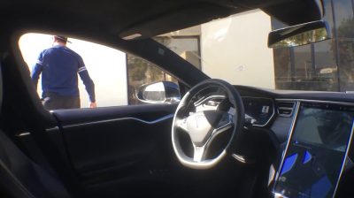 Řidič Tesla Model S aktivuje automatické parkování a opustí okno, když auto přijde na úzké parkovací místo.