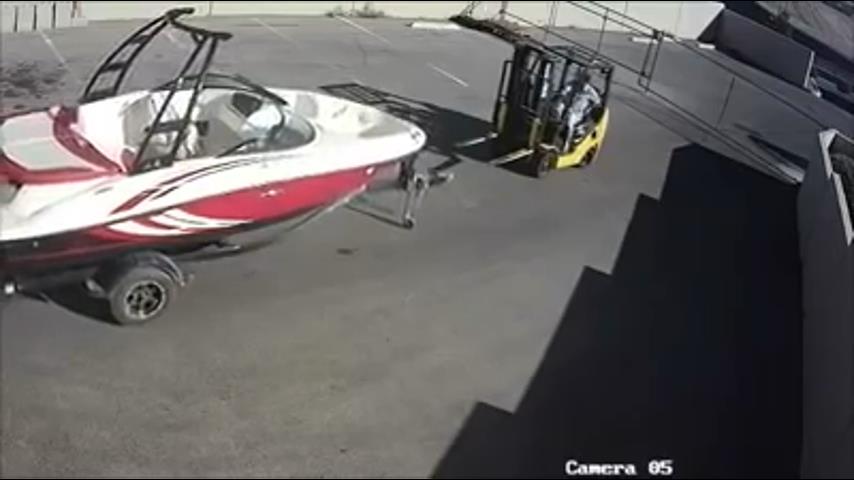 Člověk se snaží přesunout přívěsem lodní, pomocí vysokozdvižného vozíku.