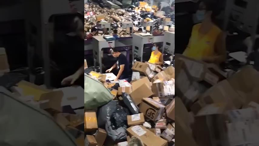 Obrázky pozemku třídící centrum v Číně. Nadměrný objem lodní vytvořilo nepořádek.