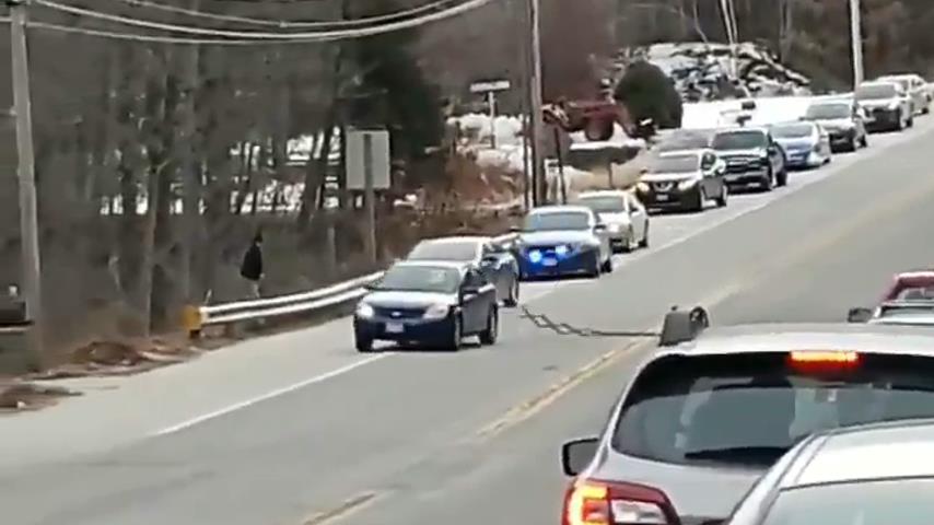 Ve městě Windham ve Spojených státech, Tyler Bisset šla nakupovat s manželkou, když ho policie požádala zastavit na kraji a počkat v autě. V té chvíli, Policie zřídila pruh hřebíky, které čekají na dostat z bodu A chtěl muž. Podezřelý vůz přišel urychlení kliknutím na nehty, ovládání ztraceno, a skončil v Tyler Bisset autě zaznamenal scénu.