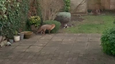 V zahradě rodinného domu v Londýně, liška a kočka hraní chase.