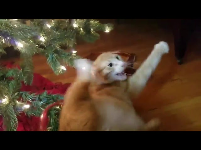 Kočka se snaží velmi zábavný způsob, jak uchopit větve vánočního stromu.
