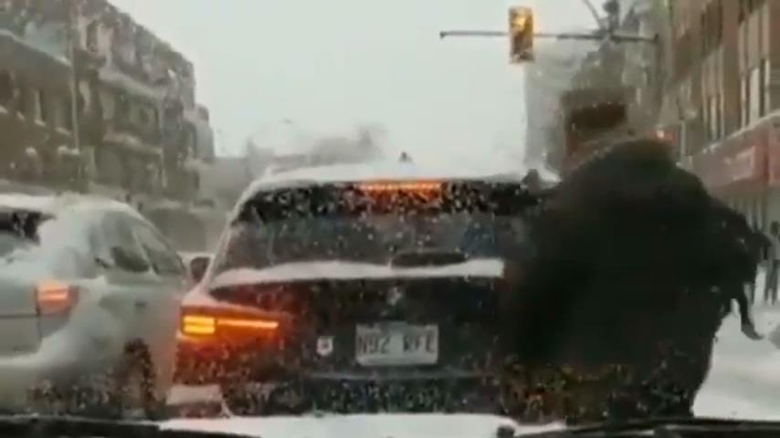 Během neúnosnou dopravní zácpě kvůli sněhu v Kanadě, průvodce bude obzvláště frustrovaní nevědomé chování přední části.