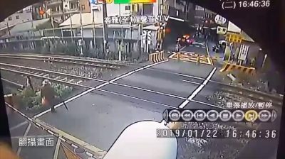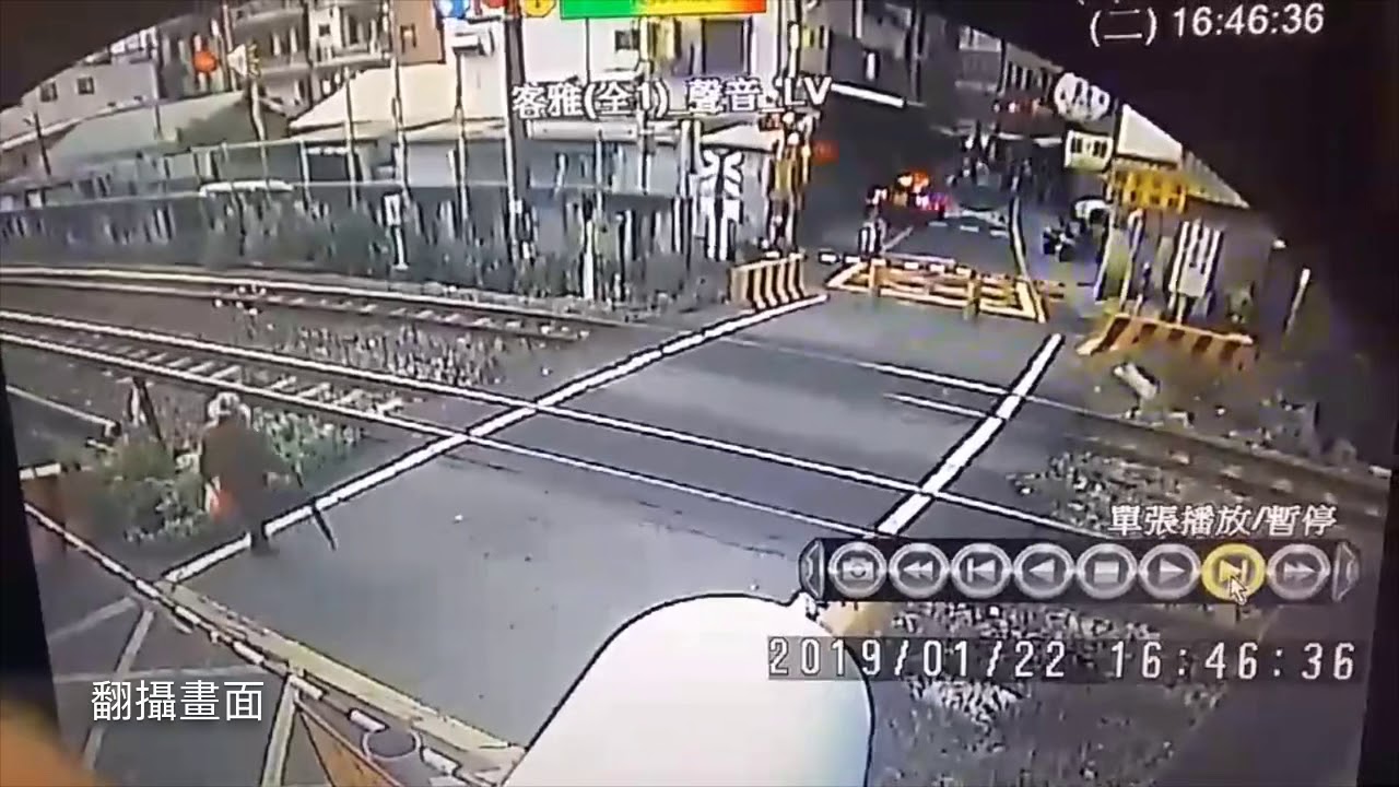 Postarší žena ve městě Tchaj-wanu Hsinchu pomalu prochází přes železniční přejezd a přichází s velkou rychlostí vlaku.