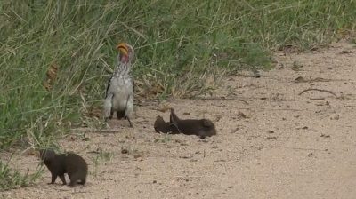 Ve městě South Africa Hluvukani, mladý mongoose hraje mrtvý v přední části zoborožce, kteří se snaží plně zájem porozumět tomu, co se děje.