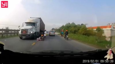29. ledna 2019 ve městě Nam Dinh v severním Vietnamu, matka s dítětem pádu z motocyklu a otcem jeli, když jejich vůz najel na světlo. Matka s dítětem padne na cestě k blížící, pokud jde o rychlost kamion. Utečou na centimetry od nákladních kol, zatímco jeho matka učiní záchranné krok tažení dítěti naposledy v náručí.