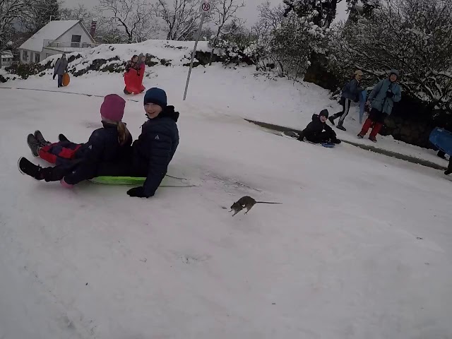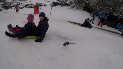 Krysa napadá lidi sáňkování na zasněžené silnici.
