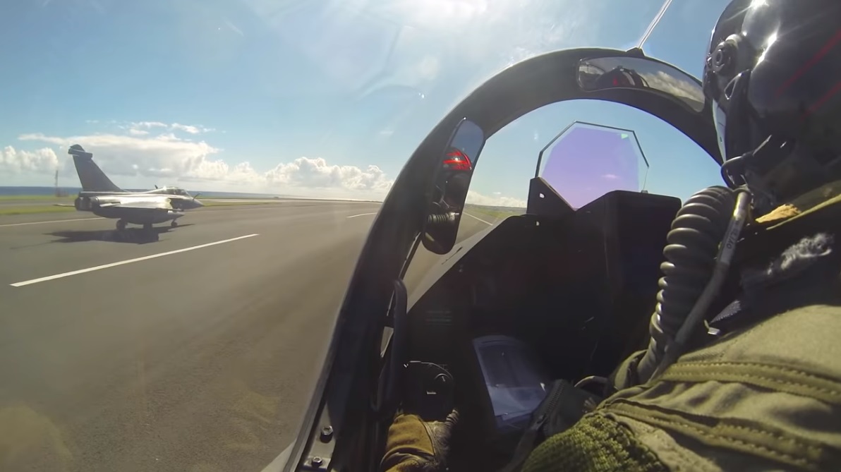 Pilotní Rafale Solo Display demonstrace tým francouzského letectví, aby nám prohlídku na sopečný ostrov setkání poblíž Madagaskaru. Letoun použitý je Dassault Rafale.