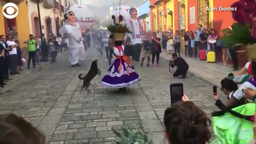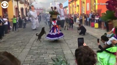 Pes se podílí na tradiční mexické svatební tanec v Oaxaca City, ukazovat své taneční dovednosti.