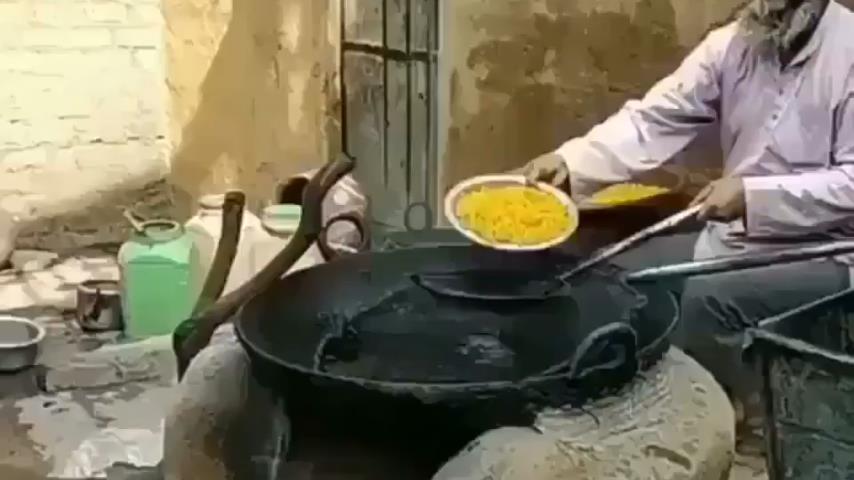 Prodavač nám ukazuje, že připravuje krajně Far, indický občerstvení sestávající převážně z bramborového škrobu, a tapioca mouky. Far-Far okamžitě bobtná při vaření v rozpáleném oleji a je připraven během několika sekund.