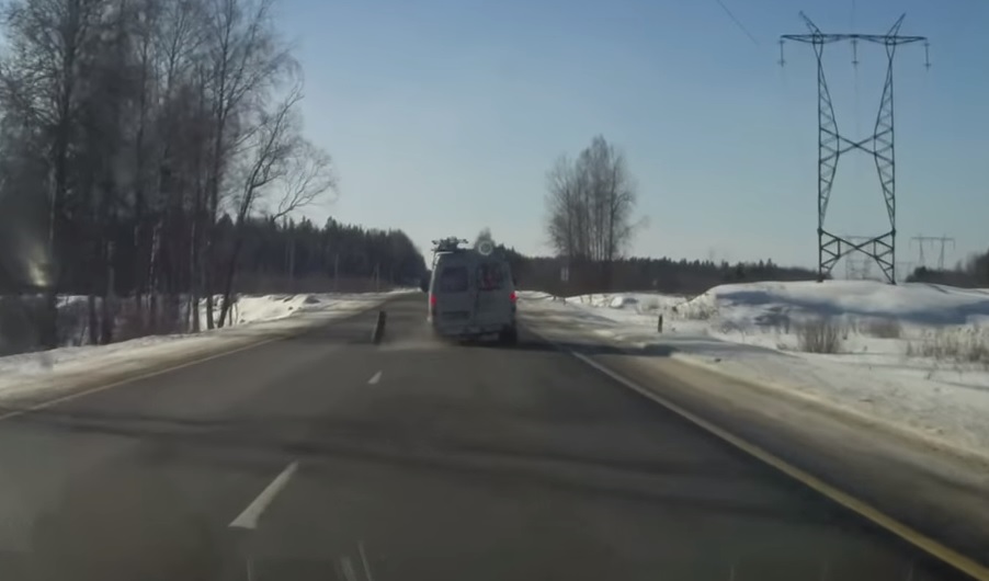Dne 4. března 2019 (Datum na fotoaparátu je nesprávné) v Petrohradě, Rusko, dodávka (Gazela) ztrácí levým zadním kolem, jak se pohybuje po silnici. Kolové rohlíky a končí v jiném stejného modelu dodávkových vozidel pocházejících z blížící.